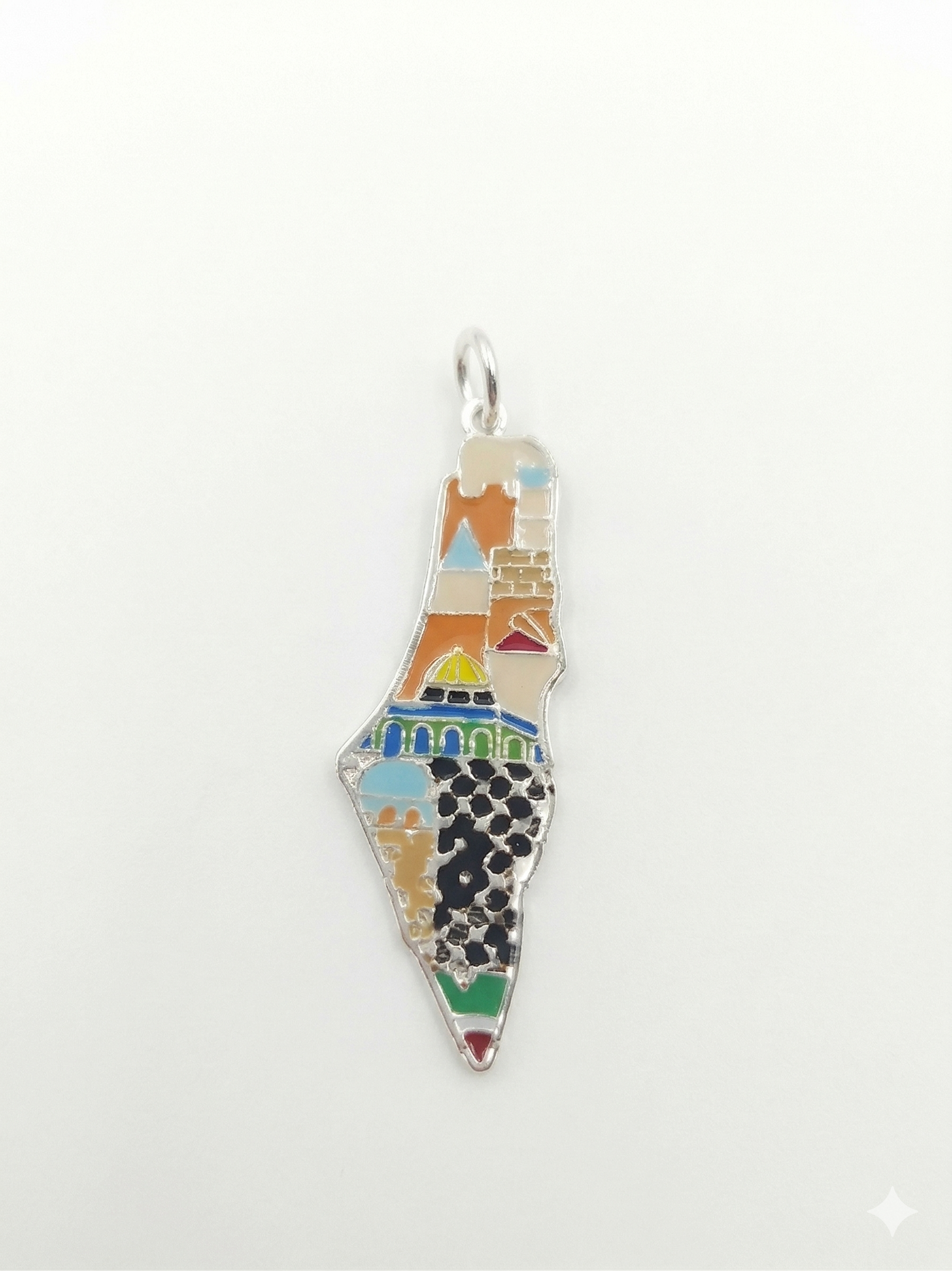 The choice of silver as the medium is deeply significant. Silver is a “living” metal; it tarnishes and shines based on how it is cared for. In this story, the silver frame acts as the protector of the narrative. It holds all these disparate elements—the dome, the Keffiyeh, the stones, and the colors—together in one unified piece.