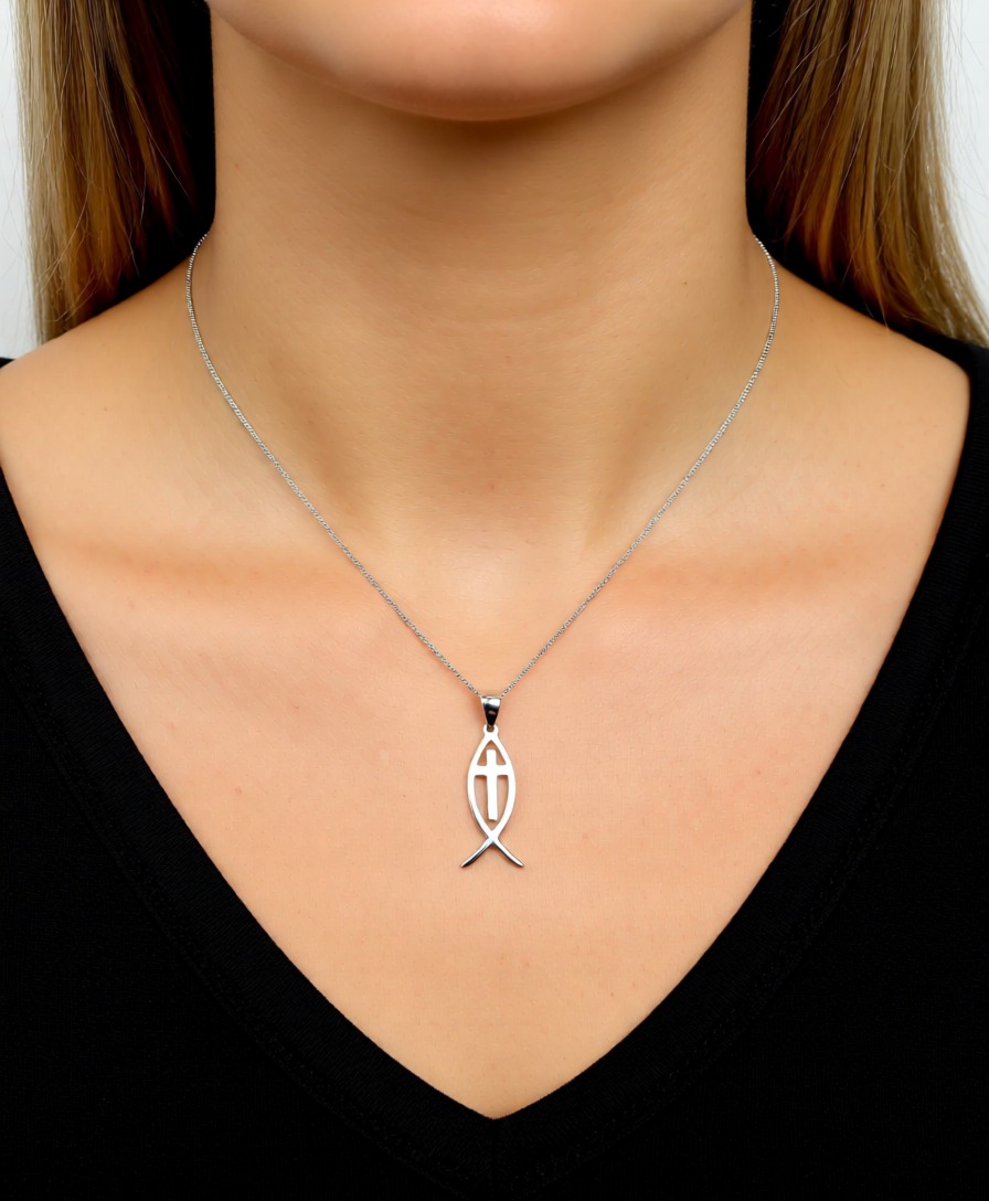 Modern Silver Ichthys Fish With Cross Pendant