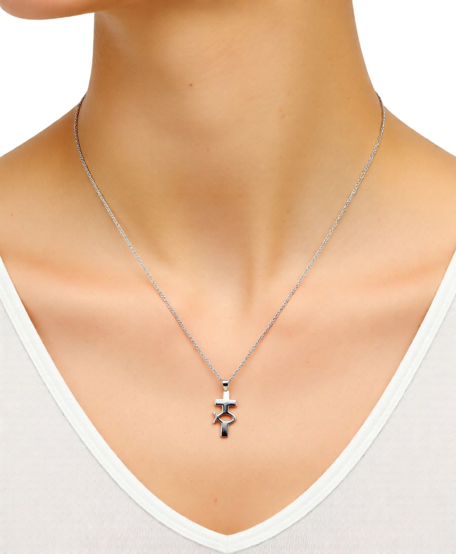 Modern Silver Ichthys Cross with Fish Pendant
